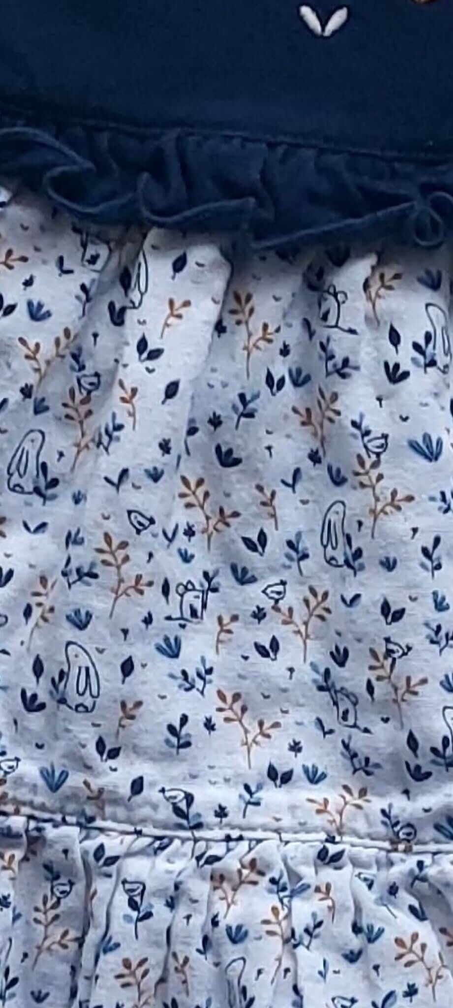 Très belle jupe doublée de couleur bleu nuit et blanc avec motifs fleurs, lapins, souris ..