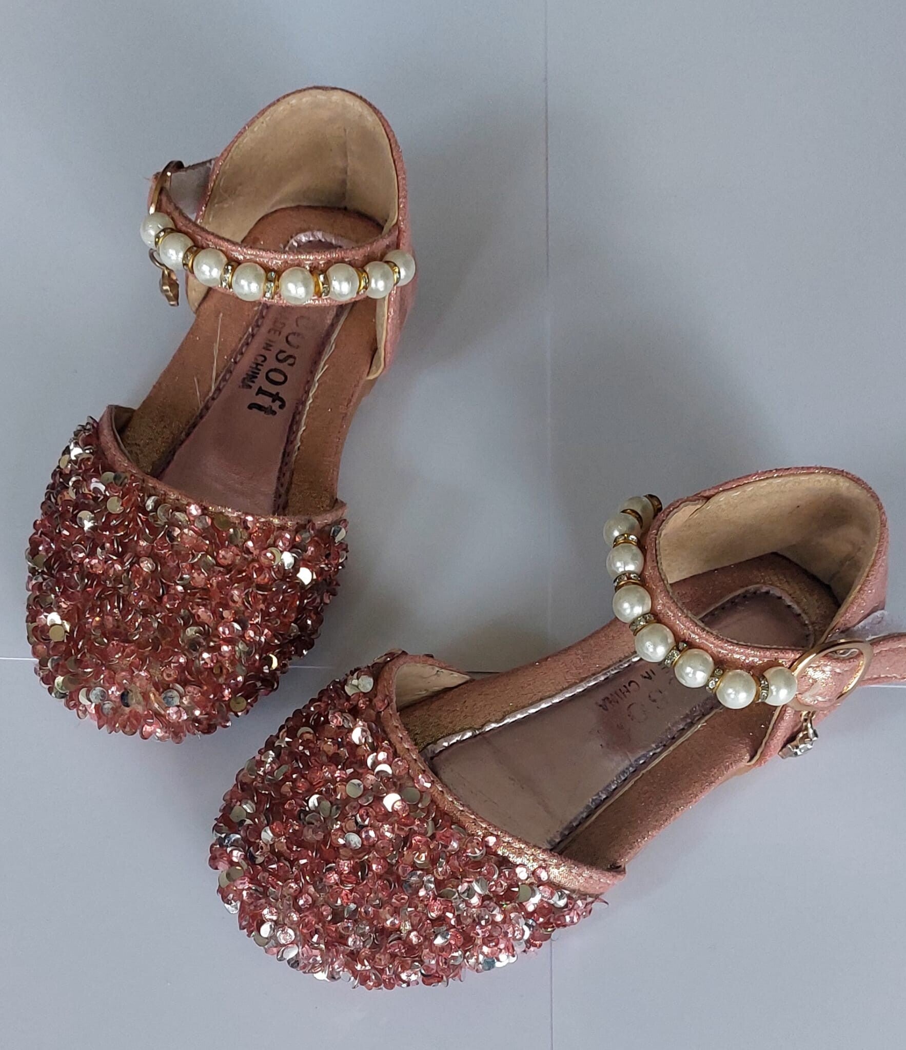 Adorables petites chaussures habillées couleur rose doré, ornées de sequins scintillants sur l’avant et d’une bride décorée de perles.